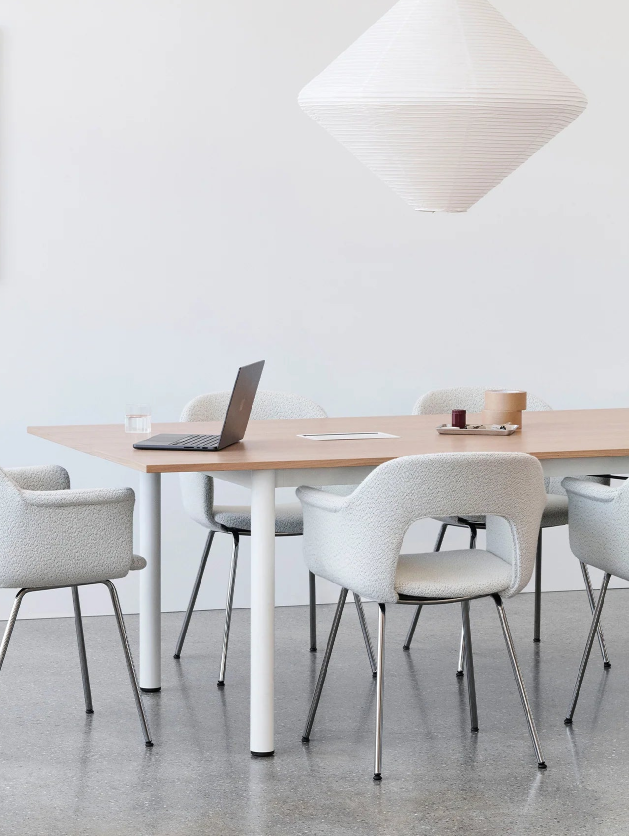 Featuring rounded slim tubular legs that provide stability and a timeless appeal, the chair has a moulded foam upholstered seat and back for a warm, inviting expression. With sustainability in mind, the chair’s components can be fully disassembled to extend its lifespan and allow refurbishment over time. The shell is crafted as a single piece with integrated armrests, enhancing durability and offering versatile support.