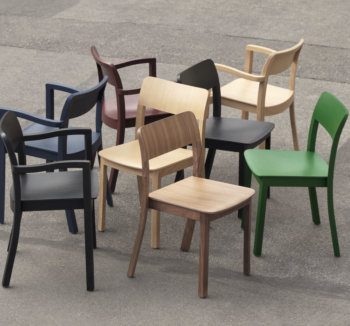 Available in a variety of lacquered wood types and colours, Pastis's durability and comfort makes it suited to many indoor spaces, from dining rooms and kitchens in private homes to cafés and other public environments.