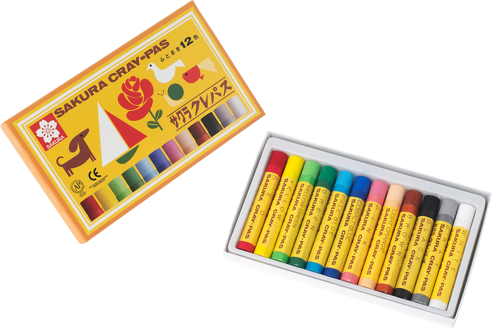 Fab crayons in a fab retro box. 12 oil pastels in beautiful rich colours - and they teach you the Japanese hiragana for each colour!