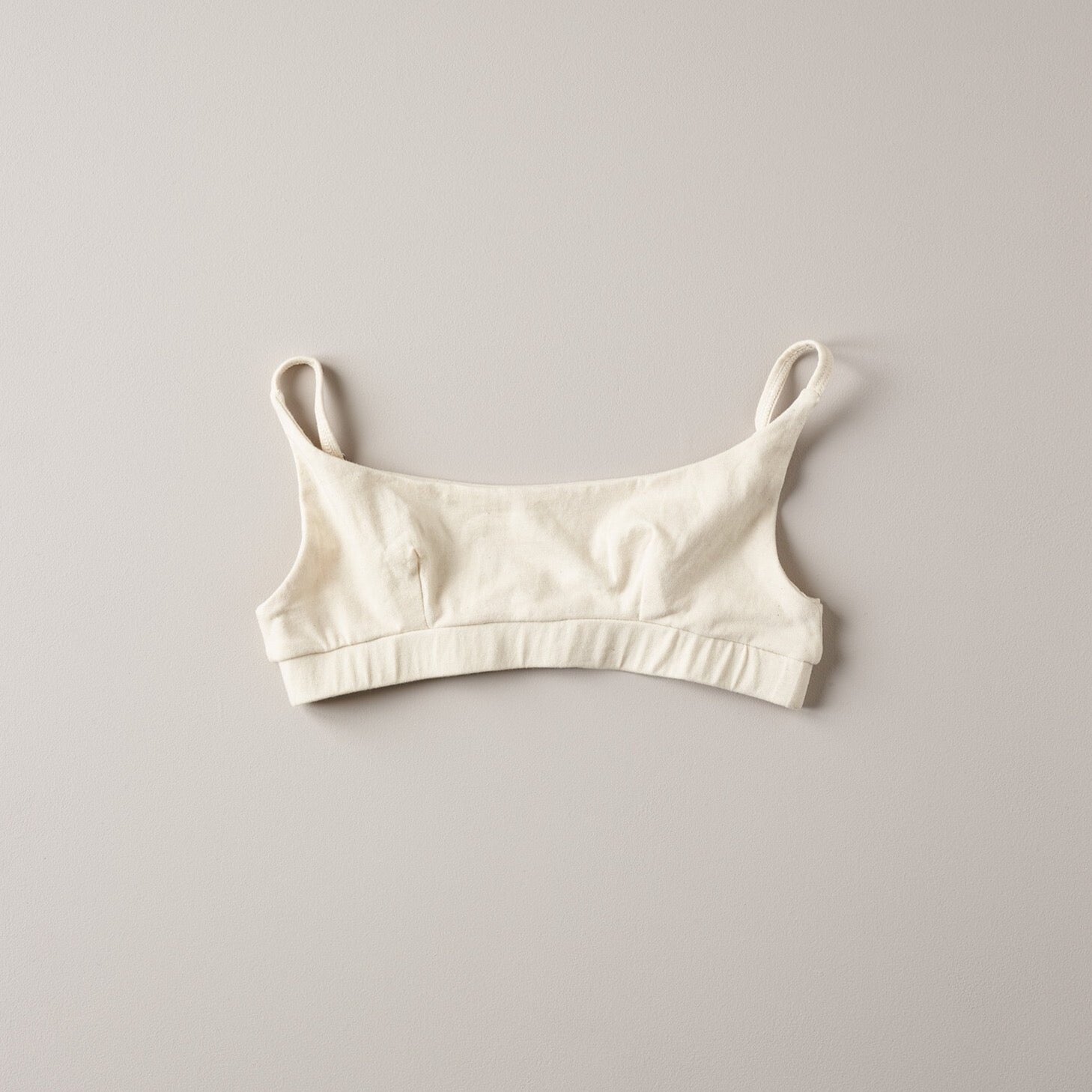 Soft organic cotton crop top in a charcoal navy with a covered underband and straps for extra comfort. Provides light support. Darts on the bust for shaping. Adjustable straps.