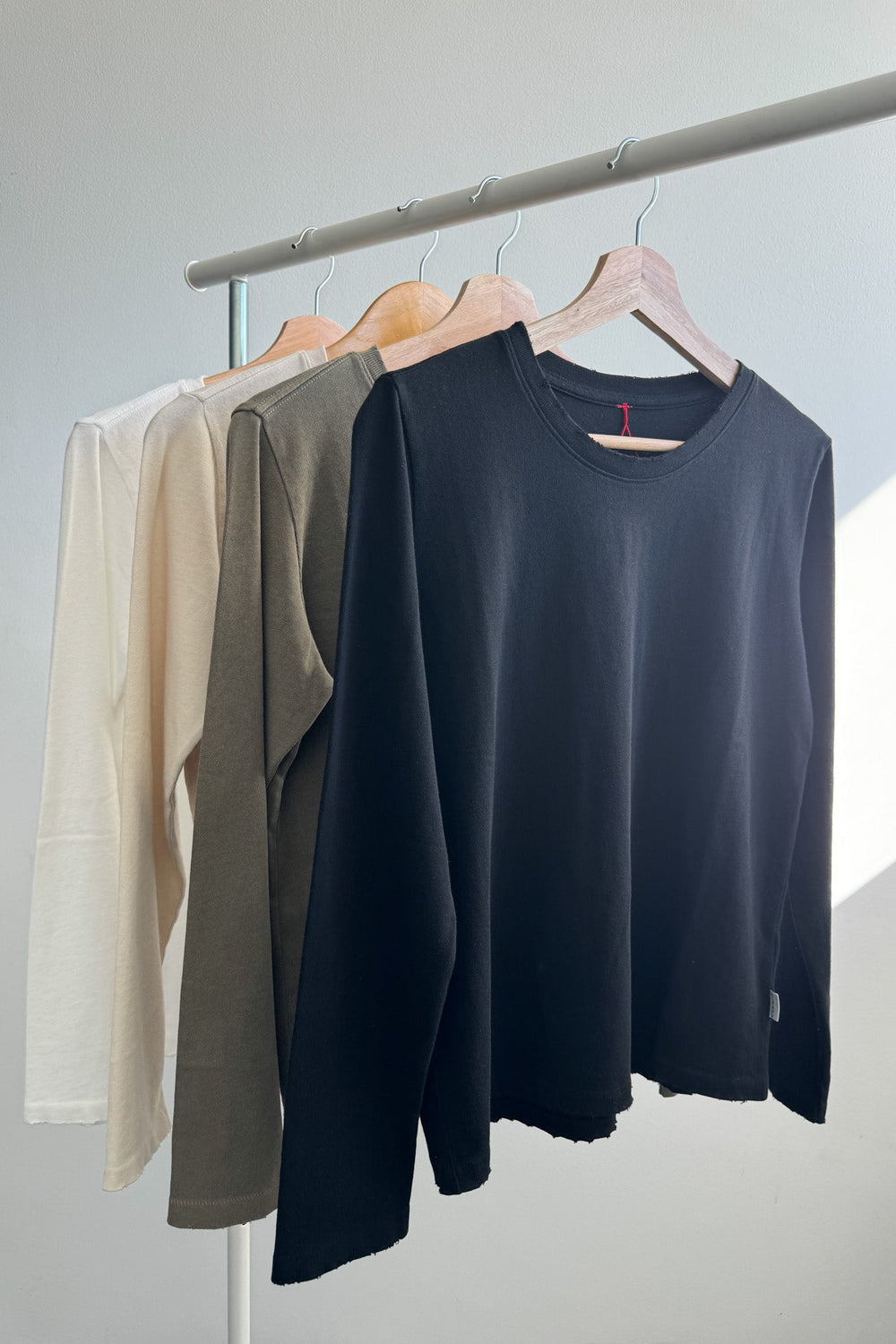 Meet the Everyday Long Sleeve Tee, a wardrobe staple made from 100% cotton premium jersey. It maintains a relaxed fit but remains true to size, making it the perfect everyday laying piece. Slightly distressed details on the neckline and hem give it that lived-in feel. Style it with the Louie jacket and denim for a classic, layered look.