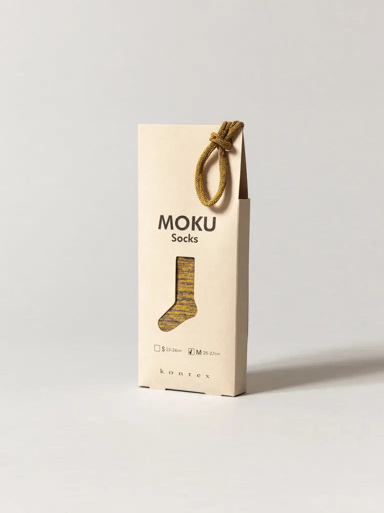 Soft, durable footwear made from the same absorbent  fibers as our Moku Towel From their eye-catching patterns to their cushy soles, these Moku Socks are designed with both visual and practical considerations in mind. By using the same ultra-absorbent cotton found in our bestselling Moku Light Towel, Kontex ensures that these socks quickly and effectively wick away moisture to keep feet dry, while the sole features a layer of thick pile for additional comfort and support. Each sock is also knit on a machine designed for sportswear to bring extra durability to the design. Materials: Cotton 85% cotton, 10% polyester, 3% nylon, 2% polyurethane Dimensions: Small: US men's 5-7, US women's 6-8 (22~24 cm)