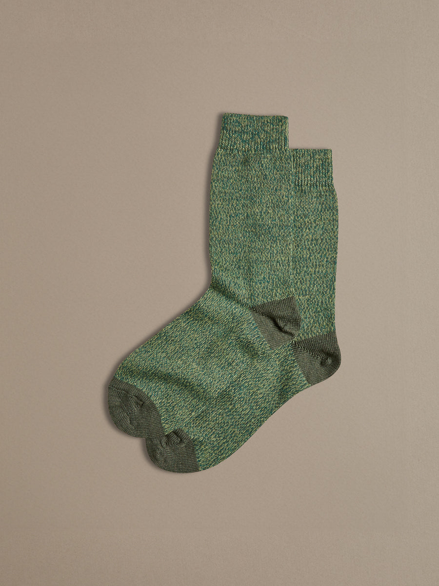 ROVE's popular fine merino wool socks are soft, breathable, and perfect for year-round comfort. Knitted with custom-spun marl yarn in three shades of green, they offer a subtle speckled texture. Designed for everyday wear, these socks feature a soft elasticated rib that stays in place without digging into your calf, completing any outfit with ease.