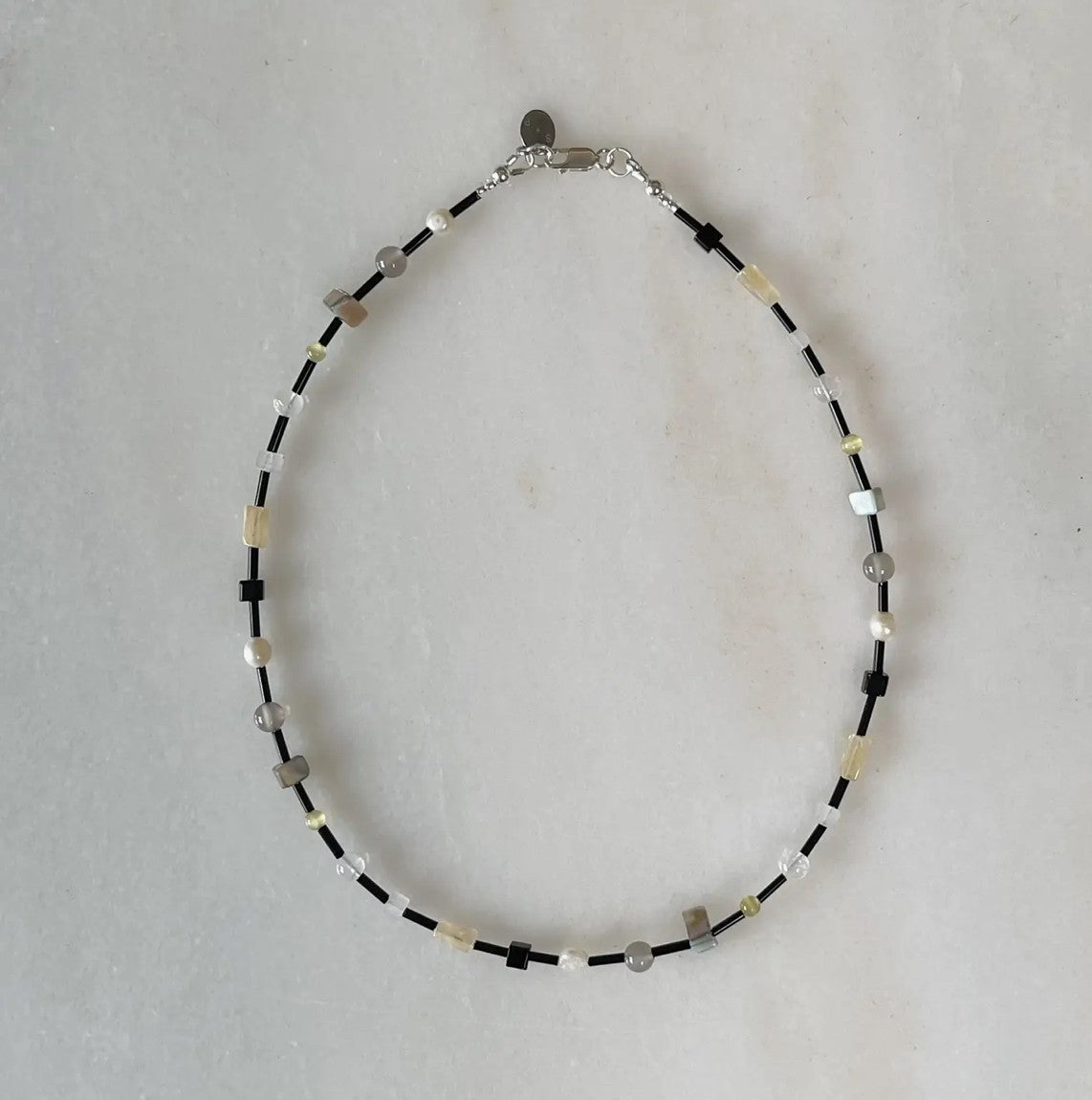 Materials: Mixed shell/pearl/and agate beads with black glass tube beads. Wire cord with sterling silver hardware.