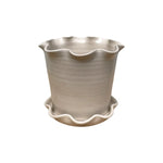 Stoneware pot with a frilly rim thrown on the wheel by hand using an off white clay with a drainage hole punched into the bottom once leather hard. Fired once to 1000 degrees celsius, then stamped, waxed, and dipped individually into a glossy transparent glaze. Once dry the pieces are ready for their final 1260 degree firing. Suitable for both indoor and outdoor use. Measures approximately: Small: Pot - 12cm x 10cm