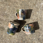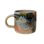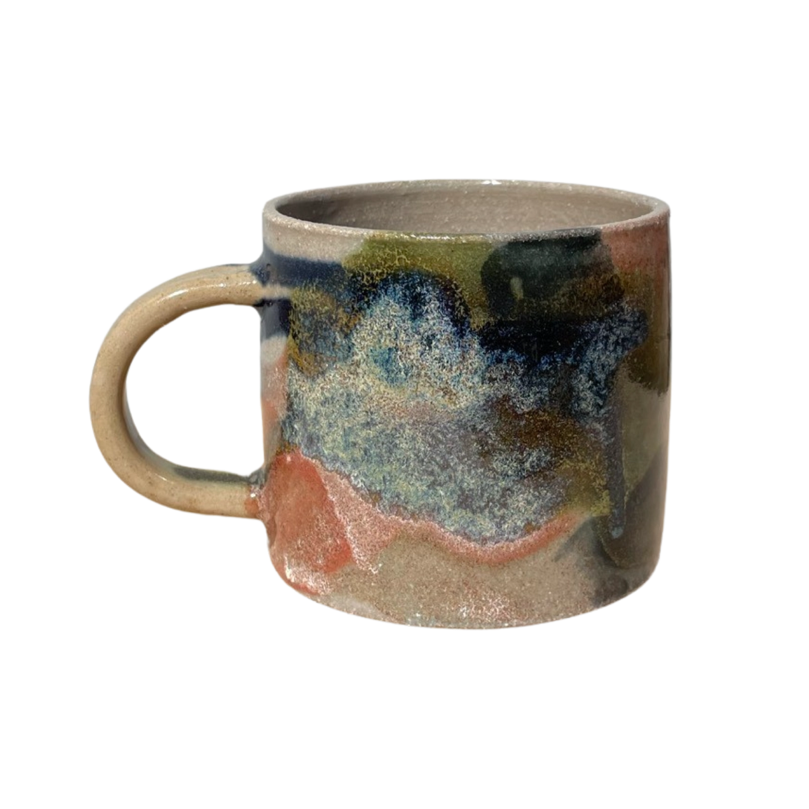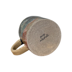 Stoneware mug thrown on the wheel in reclaimed clay with a handle attached by hand. Bisque fired once when dry, stamped, waxed and decorated using a series of glazes. The piece is then placed back in the kiln for its final 1230 degree centigrade glaze firing. Each piece is decorated by hand making each mug completely unique. Approximately 9.5cm wide x 9.5cm tall