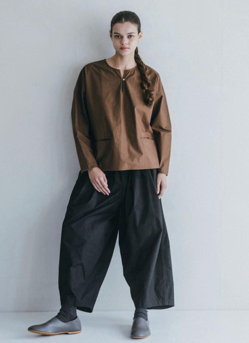 A boxy cotton pullover with a crisp texture, drop shoulders, and a relaxed fit for a comfortable yet stylish feel. The deep slit neckline with a single button adds a subtle feminine touch. A front pocket brings a quiet uniqueness to this minimalist design.