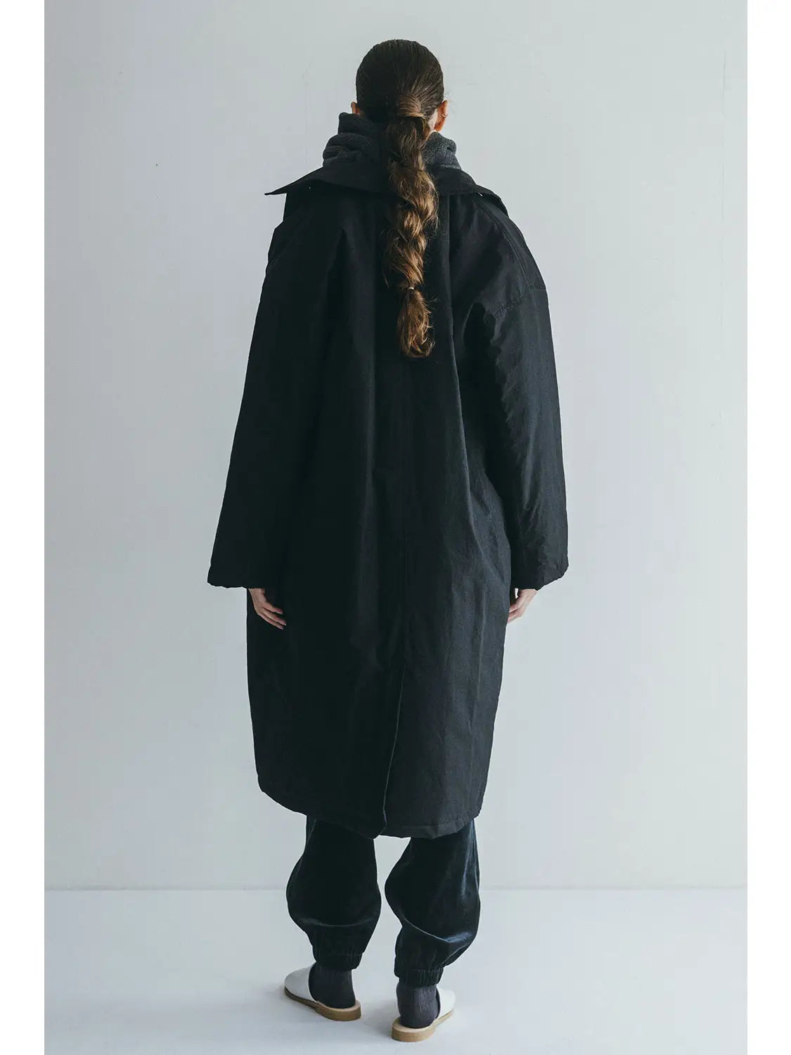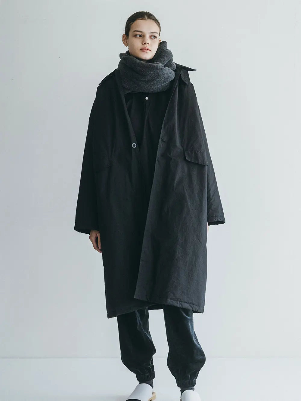 A long padded coat with a roomy fit that softly envelops the body. Simple yet distinctive, it features a flat collar that can be worn up and a clean front secured by buttons. A back slit adds comfort in movement. Warm and lightweight, it’s easy to layer over outfits in colder seasons. Finished with flap pockets.