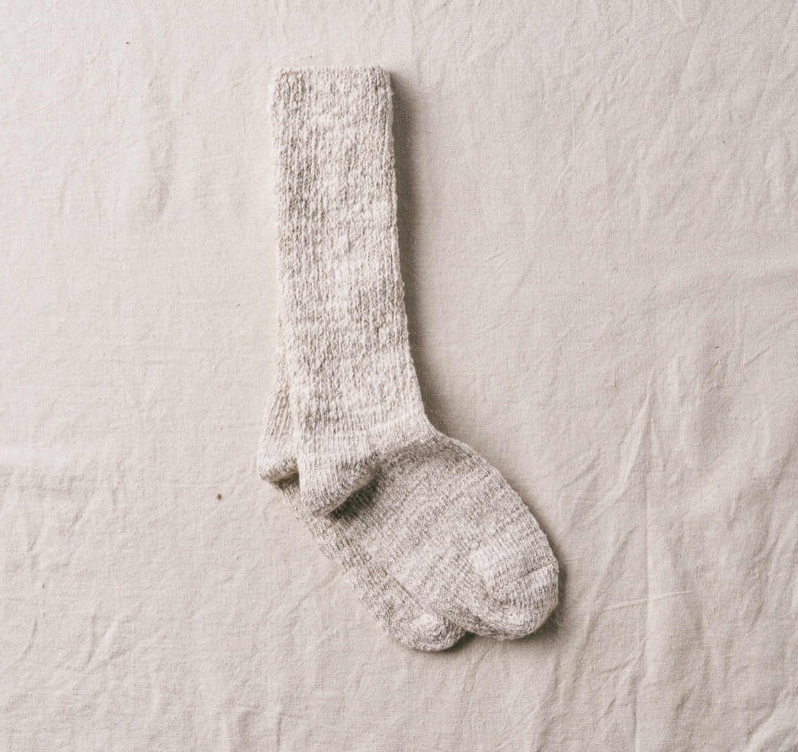 These socks use a yarn spun with the unique Japanese spinning method "garabou", and are knitted to give a less tightening, soft fit.
