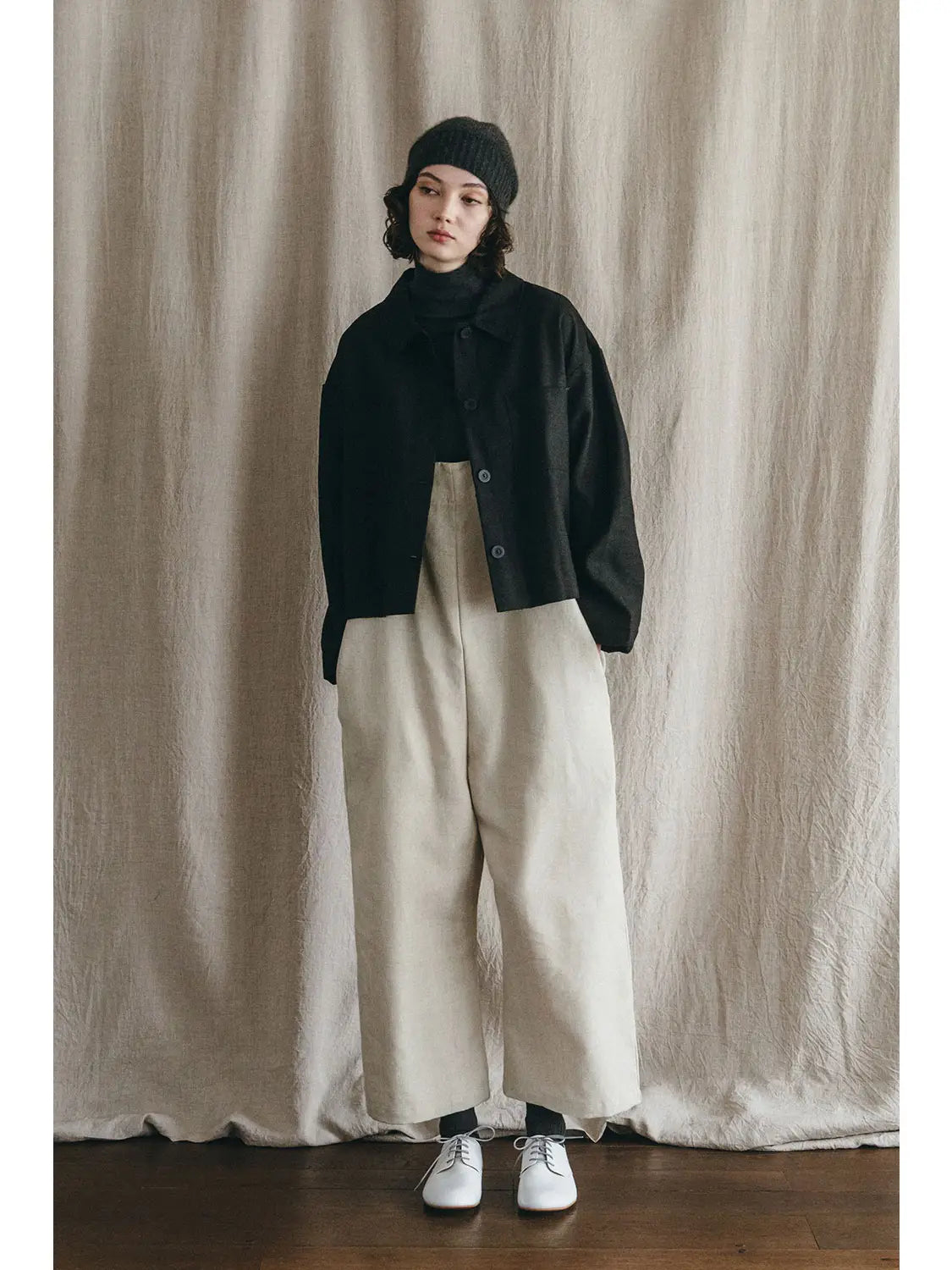 This short jacket in wool-linen fabric highlights the waist with its compact cut. Dropped shoulders create a relaxed feel, while chest patch pockets add a casual accent. The cropped length balances well with voluminous pants, skirts, or dresses. Light enough to wear like a shirt, it works equally for casual or neat outfits. Practical and comfortable, it is a versatile piece that adds structure and ease to everyday styling. model height_172cm made in Lithuania Linen 39%, Wool 19%, Tencel 30%, Henp12% size: Length51,Chest125,Neck to Sleeve81cm
