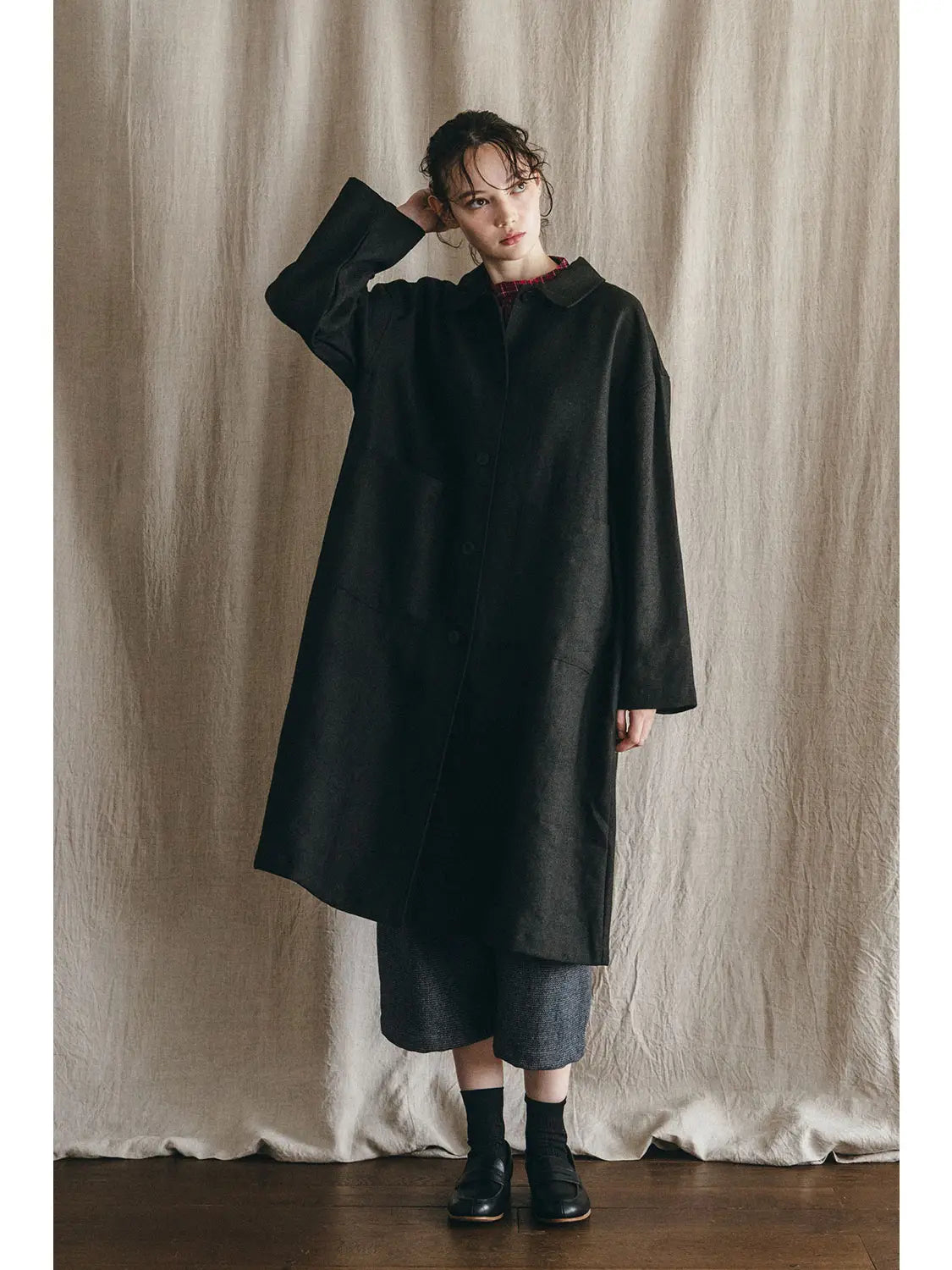 Fog Linen Rasa Coat. A wool-linen stand-collar coat becomes a timeless outer layer from early autumn to spring. A back pleat gives volume and elegance, while dropped shoulders ensure a relaxed fit. Large patch pockets add a casual detail. With its clean silhouette, it pairs easily with denim, dresses, or more formal outfits.