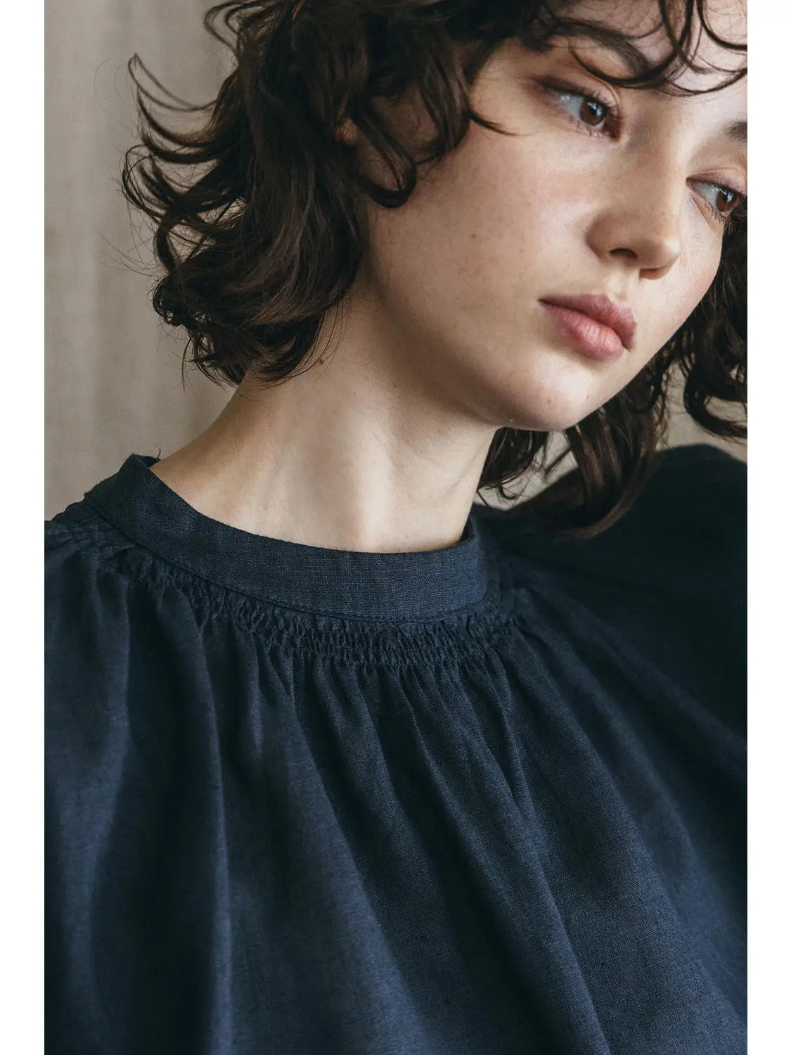 A band-collar blouse with gathers at the neckline offers gentle elegance in a clean silhouette. Boxy shape and dropped shoulders provide comfort while maintaining neat proportions. Easy to coordinate with pants or skirts, it also layers smoothly under jumpsuits or vests. Lightweight and versatile, this blouse is useful across seasons, bringing understated charm to casual or polished outfits.