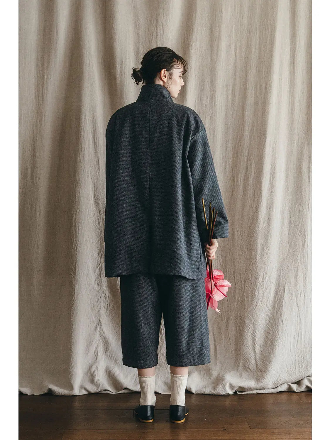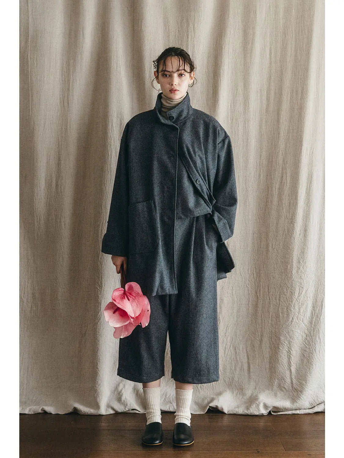 A coat crafted from mid-weight wool combines warmth with versatility. The collar lies flat for a clean look or stands with buttons closed to shield the neck. Rounded pockets add a subtle detail, while drop shoulders and a relaxed cut ensure comfort. Hip-length coverage works with pants or skirts.