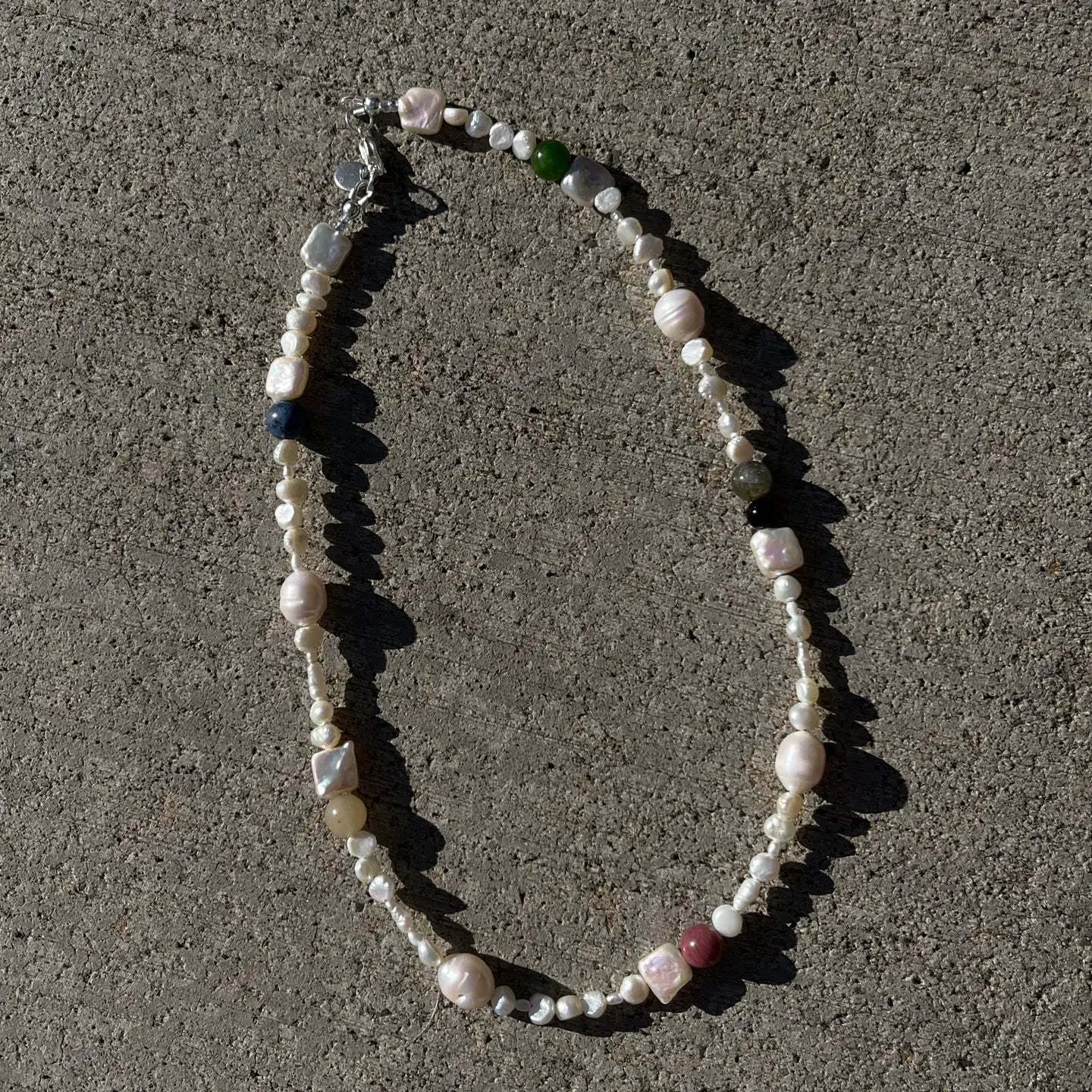 Baroque necklace Classic claw closure Available in 16”/18”/20” lengths Handmade. Materials: Freshwater cultured pearl beads and agate beads Wire cord with sterling silver hardware.