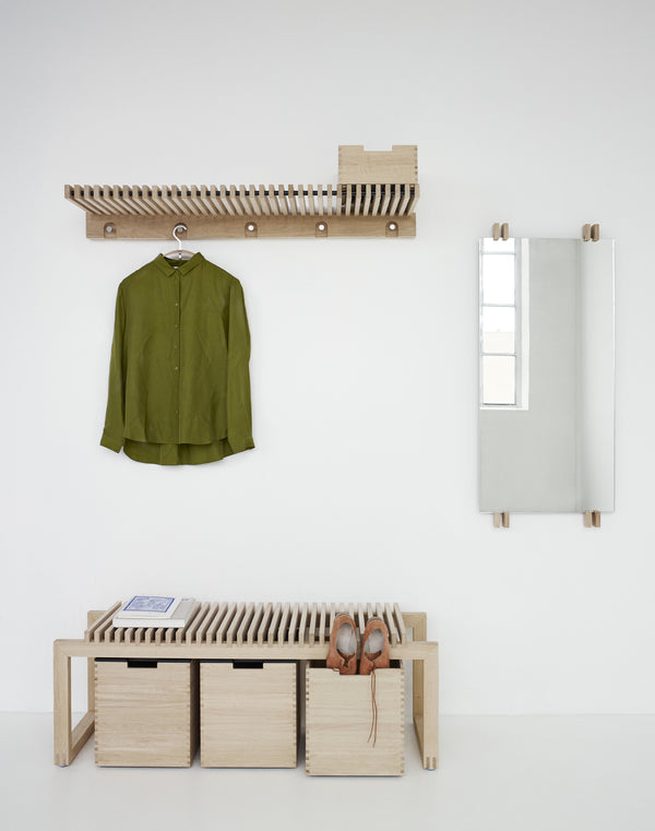 The Fritz Hansen Cutter series by Danish designer Niels Hvass epitomizes minimalistic functionality, perfect for hallways. This collection seamlessly blends beauty with practicality across distinctive pieces. The Cutter Wardrobe, light and beautiful, is meticulously designed for multifunctionality. Use it as a shelf for hats and boxes, a hanger rack for blazers and shirts, and a coat rack for coats and jackets—all in one. A perfectly practical solution for confined spaces and narrow hallways, combining style with efficiency. The Cutter wardrobe is part of the Skagerak Collection by Fritz Hansen.