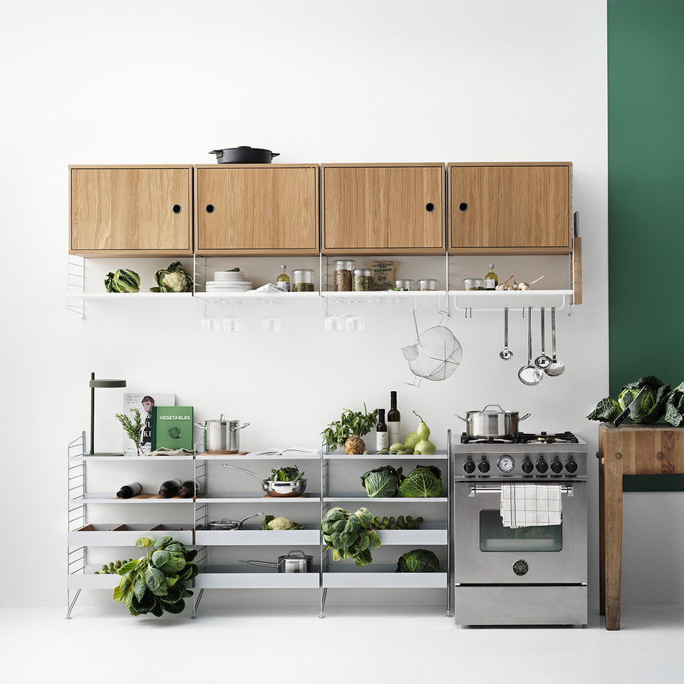 String shelf with wall panels and metal shelves with low edge along with cabinets with swing door and a rod. This wall-hung shelving combination is perfect for a kitchen. Place it close to the oven for easy access to all kitchen tools.