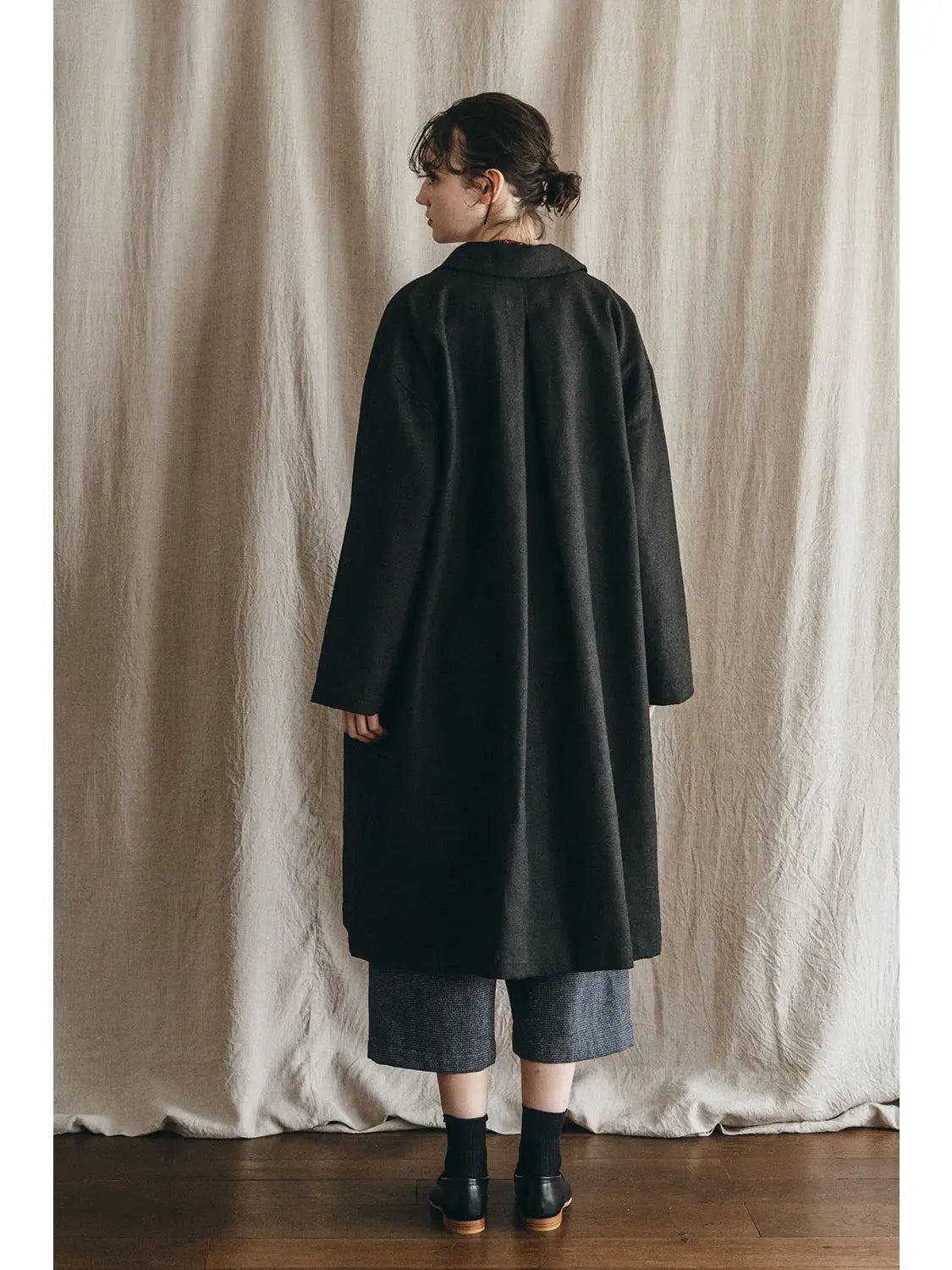 A wool-linen stand-collar coat becomes a timeless outer layer from early autumn to spring. A back pleat gives volume and elegance, while dropped shoulders ensure a relaxed fit. Large patch pockets add a casual detail. With its clean silhouette, it pairs easily with denim, dresses, or more formal outfits. Both practical and sophisticated, this coat is an adaptable wardrobe essential that combines simplicity, comfort, and refinement. model height_172cm made in Lithuania Linen 39%, Wool 19%, Tencel 30%, Henp12% size: Length106,Chest136,Neck to Sleeve82cm