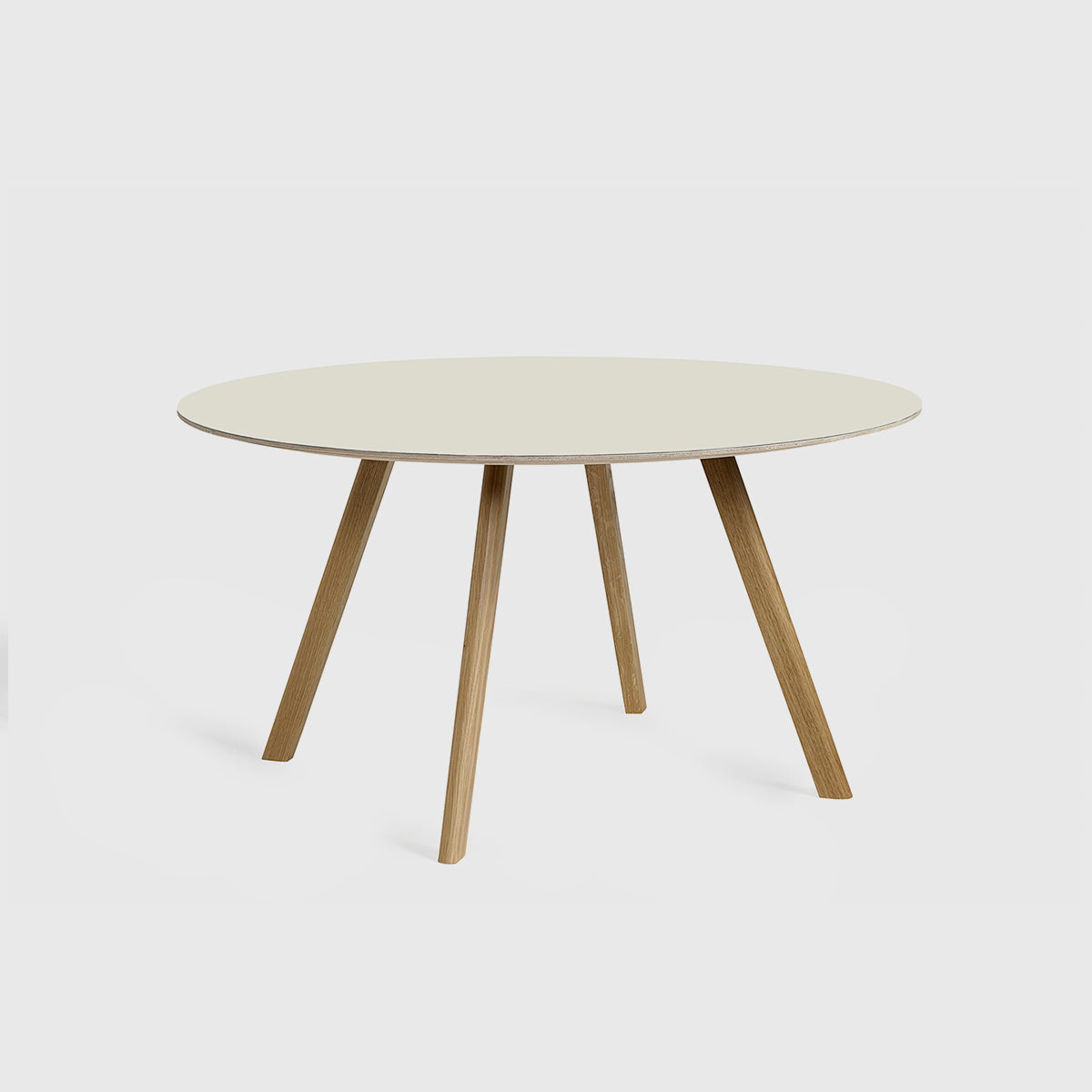 Sharing the same characteristic angled legs as the rest of the Bouroullec brothers’ Copenhague range, the CPH 25 table feature a round tabletop that softens the engineered expression. Equally suitable for intimate meetings and larger, café-like environments, this versatile table has an ability to blend into private homes as well as public spaces. The tables come in a variety of heights and sizes and are available in stained, soap-finished and lacquered oak with tabletops in veneer, laminate or linoleum.